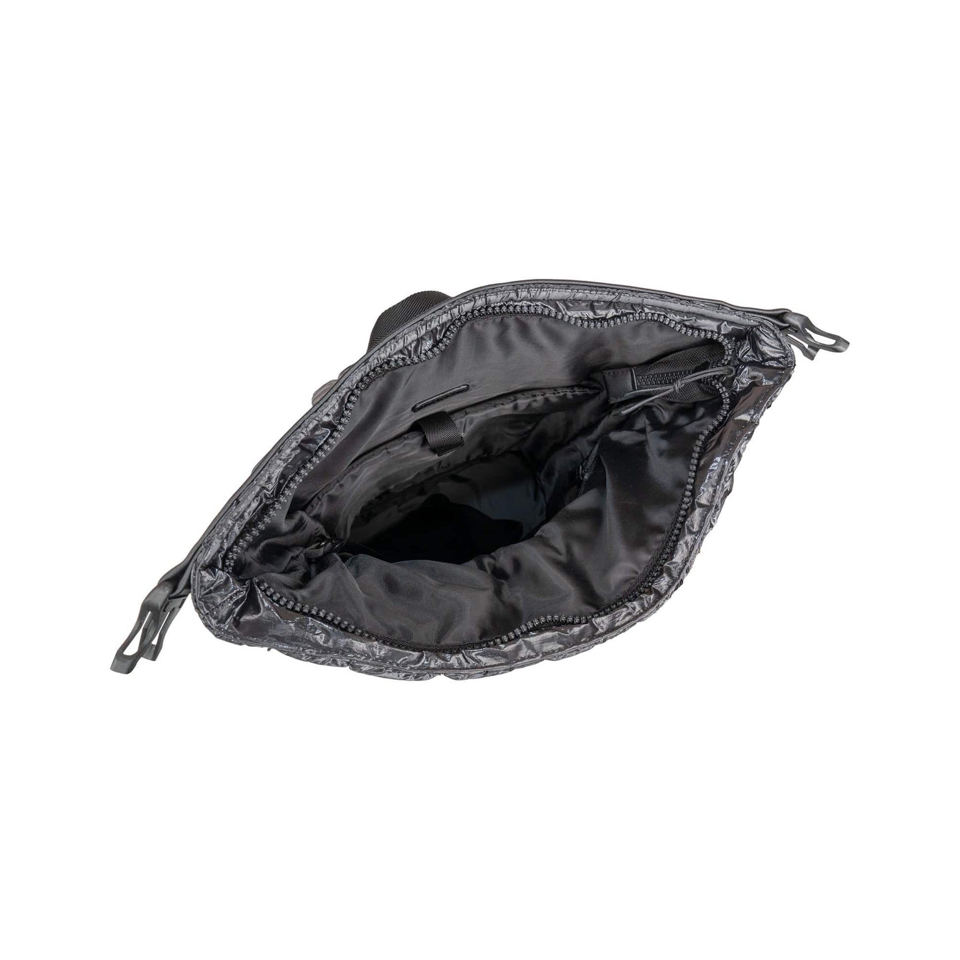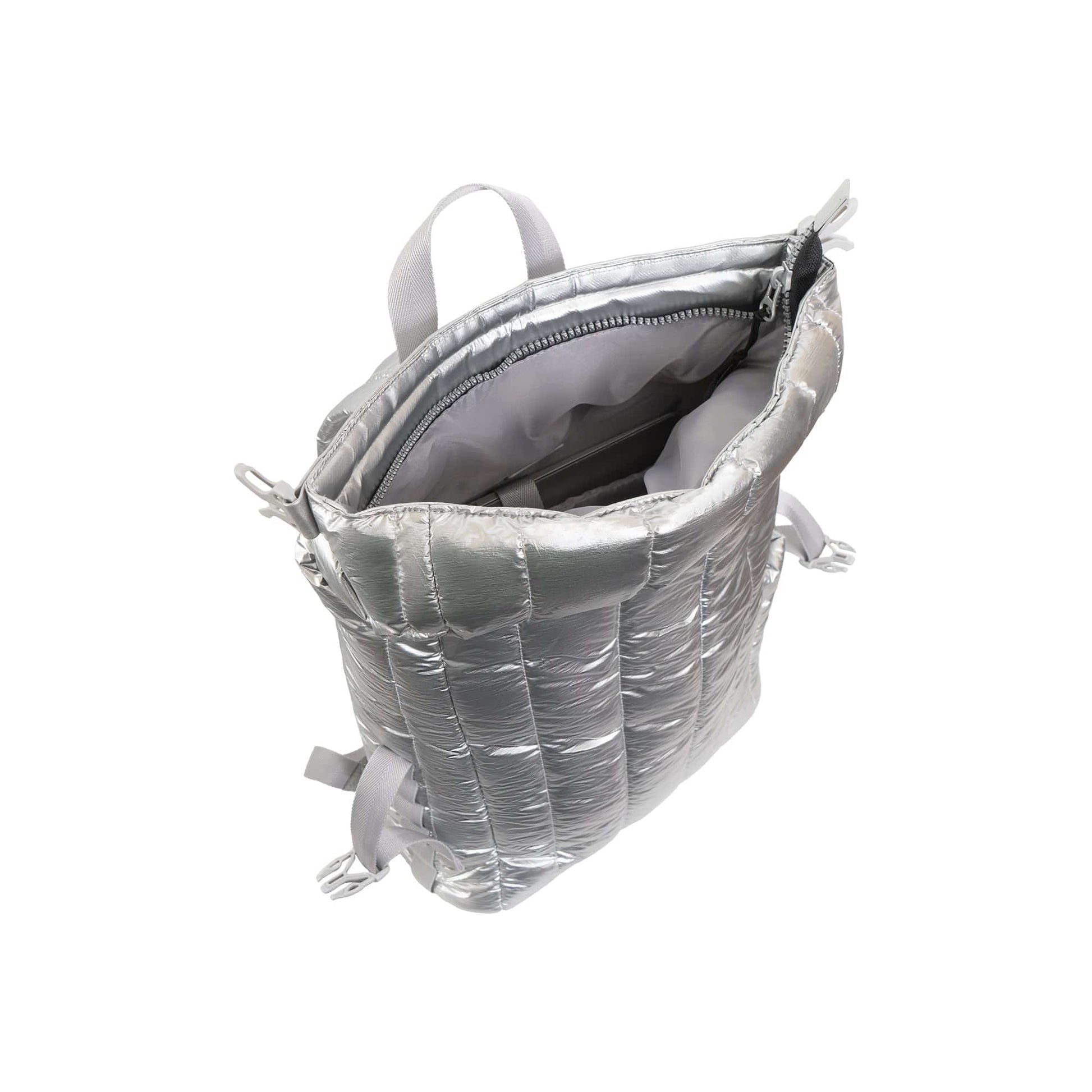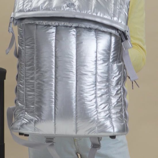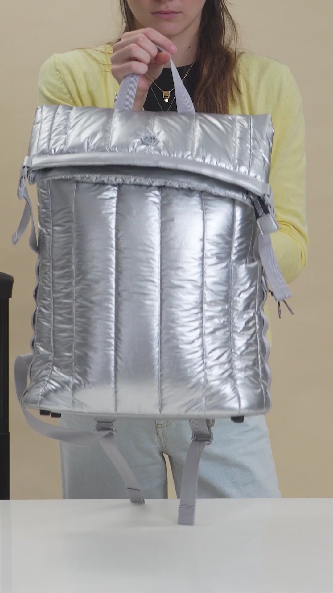 - Crafted from durable, lightweight puffer-style nylon with a sleek metallic finish.